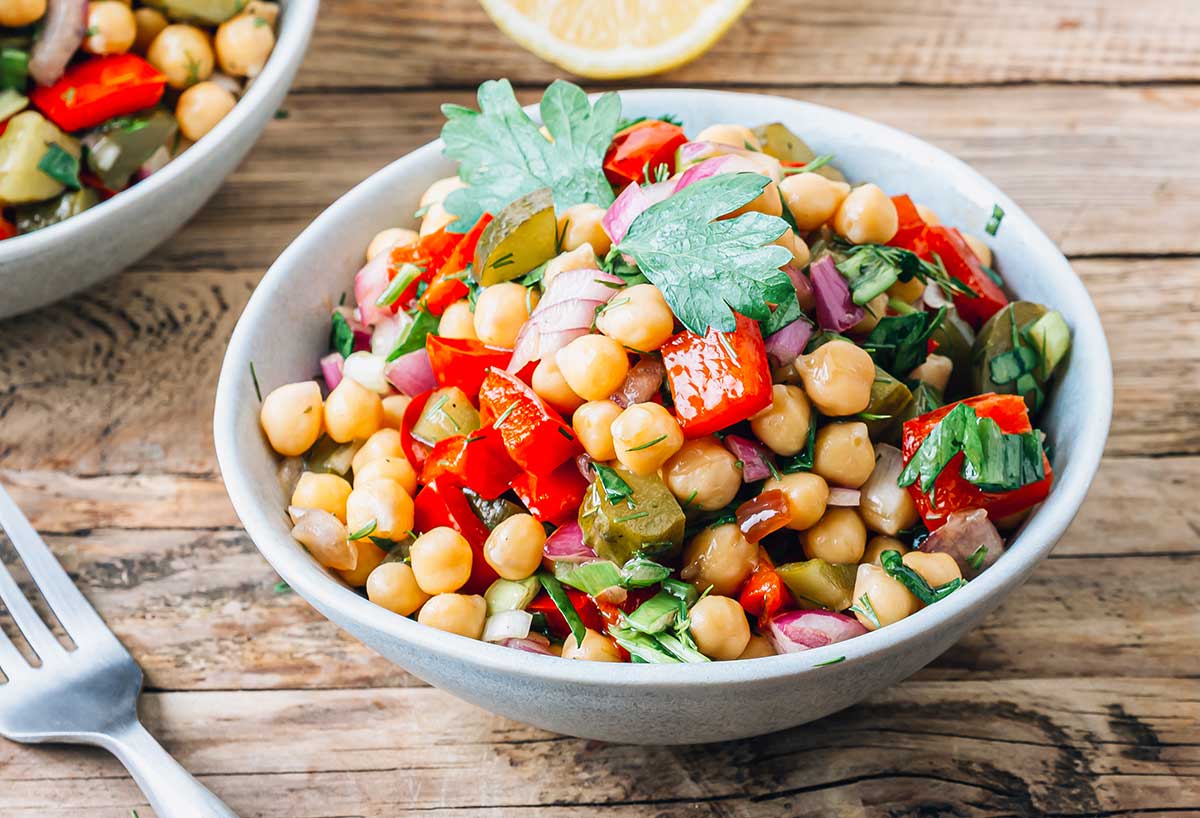 Les pois chiches sont une excellente source de protéines végétales et se marient bien avec la feta salée et les légumes croquants.