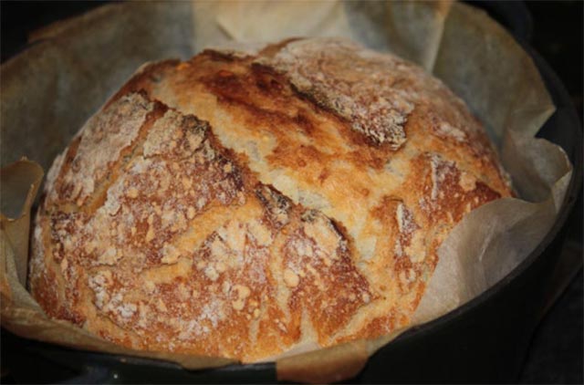 Fermer la cocotte de son couvercle, puis enfournez pendant 35 minutes. Ensuite faites descendre le thermostat à 180° et laissez votre pain cuire encore 5 minutes.