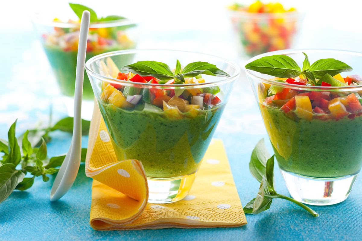 Pelez l’avocat et le concombre et lavez le basilic et la menthe, ensuite mixez le tout en y ajoutant l’huile d’olive, une pincée de sel et de poivre.